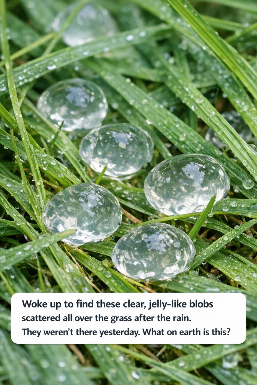 Woke up to find these clear, jelly-like blobs scattered all over the grass after the rain. They weren’t there yesterday. What on earth is this?